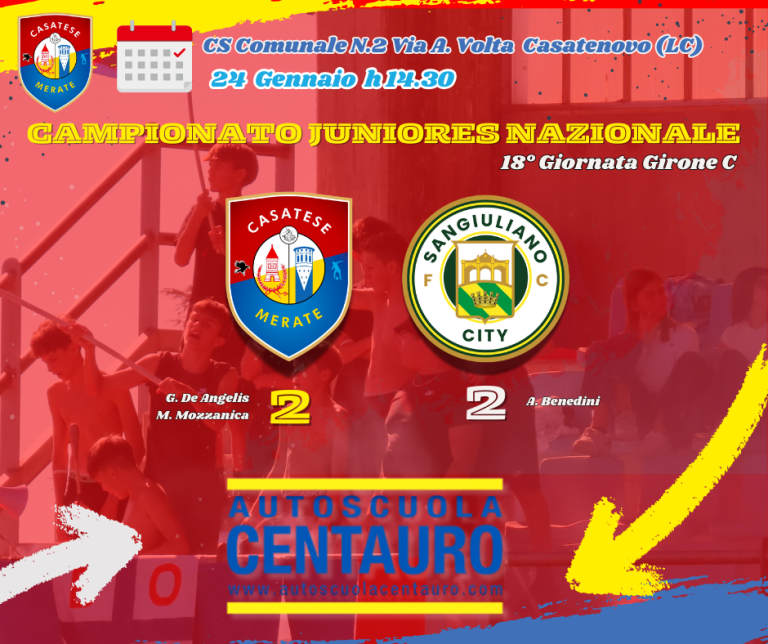 Un pareggio che vale quanto una battaglia. La 18ª giornata del campionato Juniores Nazionali U19 (Girone C) regala spettacolo al C.S. Comunale N.2 di Casatenovo, dove la Casatese Merate e il Sangiuliano City si sono divise la posta in palio con un pirotecnico 2-2.