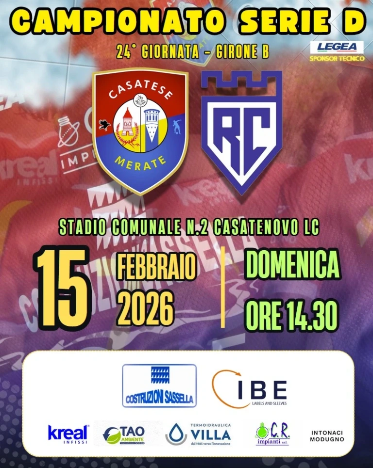 La Casatese Merate si prepara ad affrontare la Real Calepina nella 24ª giornata del campionato di Serie D – Girone B, in programma domenica 15 febbraio 2026 alle ore 14:30.